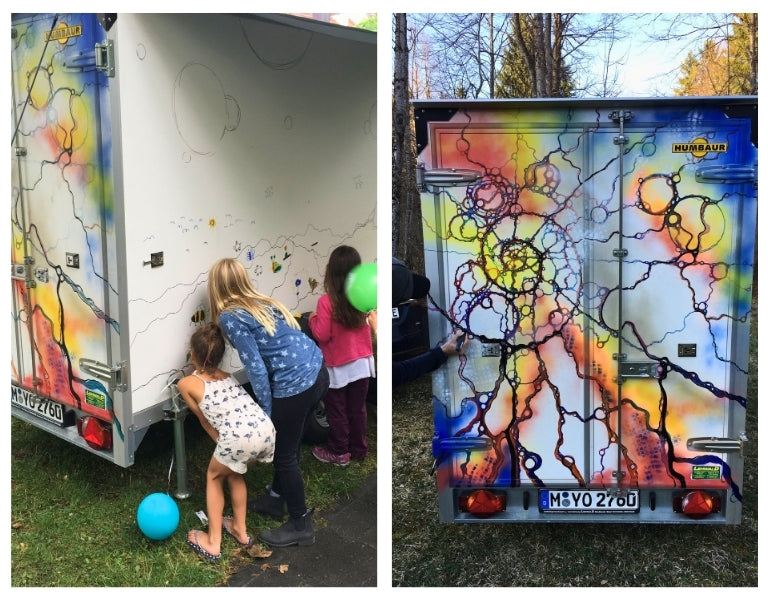 Dieser Anhänger entstand als besonderes Kooperationsprojekt mit dem Neurographik-Experten Jörg Lehmann. Auf einem Straßenfest in Gern, München wurde der Wagen gemeinsam mit begeisterten Kindern im Stil der Neurografik gestaltet.